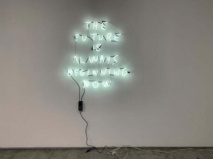 La exhibición incluye otras piezas como una serie de dibujos de un cuaderno de notas, hechos con lápiz y pluma azul que despliegan frases que nos invitan a reflexionar alrededor de la ausencia de la representación, el dibujo como la obra de arte primigenia y sobre posibles significados escondidos. Una frase escapa del papel y se despliega en un neon blanco que ilumina sutilmente el espacio vacío donde se sitúa una escultura imaginaria en la tradición de artistas como Maurizio Cattelan y Tom Friedman. En esta pieza se percibe una cierta huella post-situacionista que nos acompaña durante estos recorridos entre los objetos y la narrativa, donde la fragilidad emocional se expresa en la intensidad de las líneas del guión y de los dibujos. Unas líneas que invitan al espectador a llenar con su propia imaginación los vacíos entre las piezas y los textos de Ruben Gutiérrez.